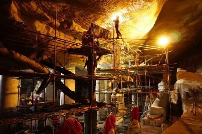洞内卧佛殿是展示佛陀示寂时的场景,殿堂内增加的佛菩萨像十八罗汉等,正在一一安置卧佛两侧。