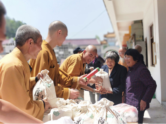 走出活动中心,来到寺院,出家师和义工们,为老人们准备了可口的素斋和一些慰问物品。一份福德食,传递着温暖与关爱。温馨感人的氛围中,一双双清澈又淳朴的眼眸中饱含着满满的欢喜之心。