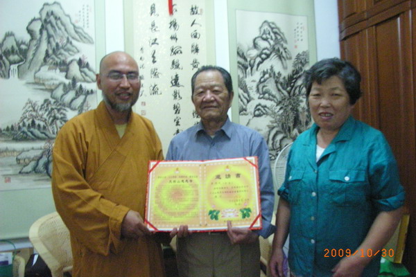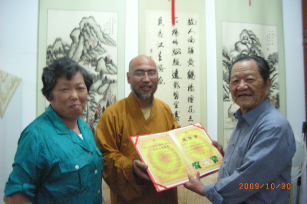当我回到鼓楼——慈恩寺在杭州的接待处,兴奋地将张老的情况向智渡法师汇报时,法师也是极为赞赏,在欣赏了张老的作品和简历资料后,即刻与张老通话、致谢,肯定了张老的作品并表明了收藏意见,同时诚挚地邀请张老担任书画研究院的顾问,并亲自登门造访为张老颁发证书。